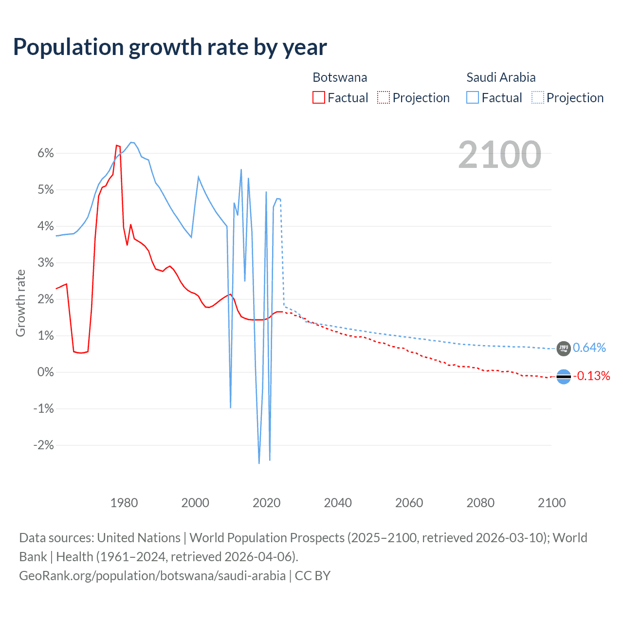 - For the last 10 years, Botswana has had an average growth rate of +1.5% per year vs +2.3% in Saudi Arabia.