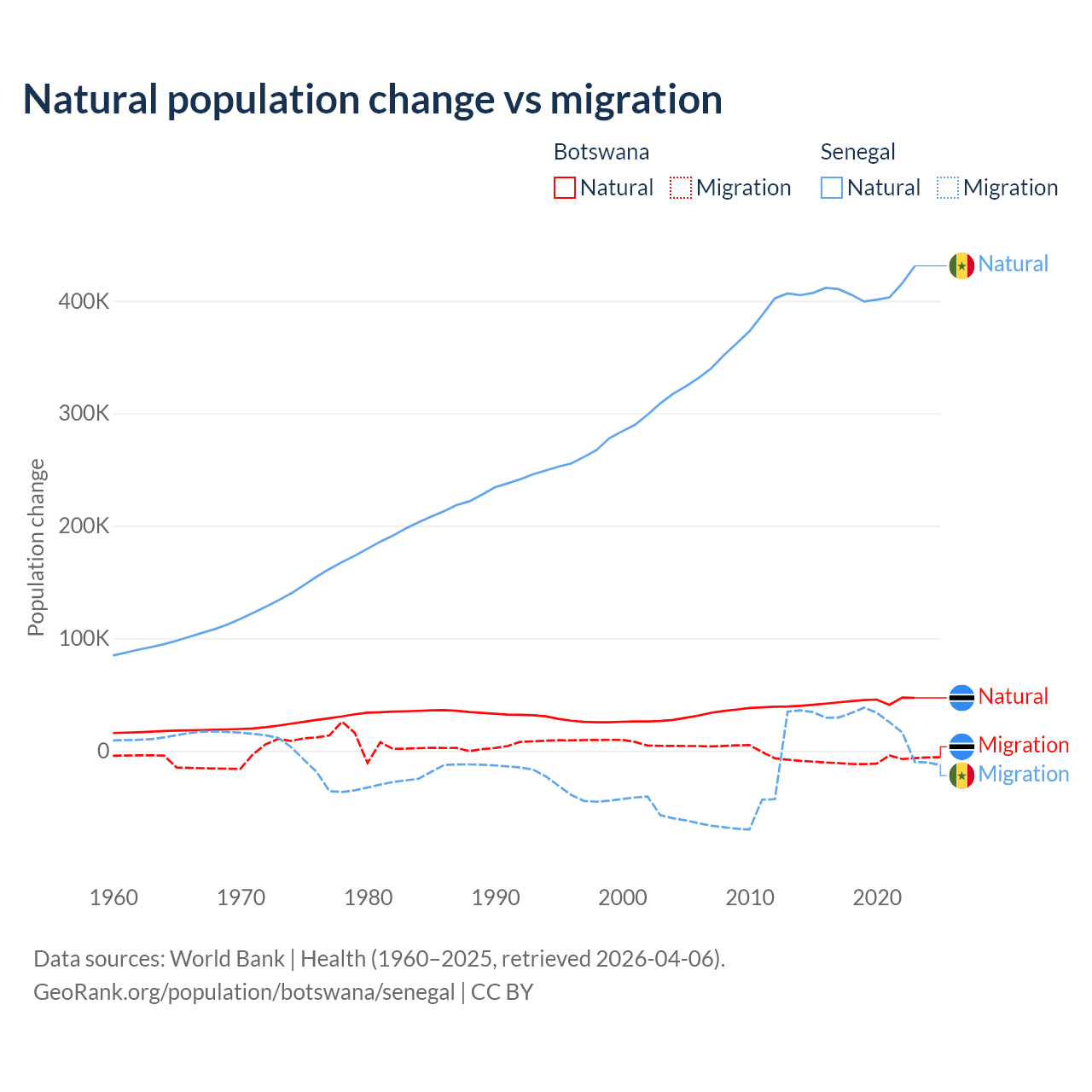 Over the last 10 years, 82.5% of the population change in Botswana is from natural causes (a gain of 436,373 people) and 17.5% is from migration (a loss of 92,293 people). In Senegal 93.9% is from natural causes (a gain of 4,089,205 people) and 6.13% is from migration (a gain of 267,266 people).