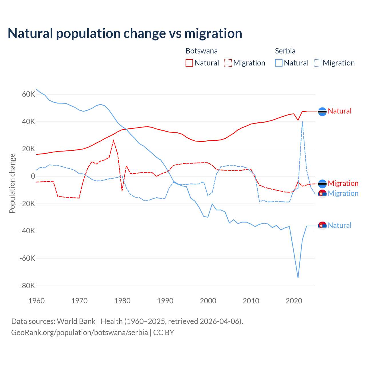 Over the last 10 years, 82.5% of the population change in Botswana is from natural causes (a gain of 436,373 people) and 17.5% is from migration (a loss of 92,293 people). In Serbia 83.3% is from natural causes (a loss of 435,148 people) and 16.7% is from migration (a loss of 87,110 people).