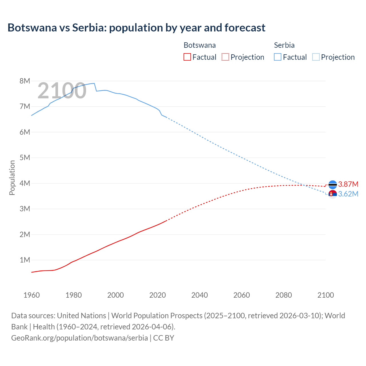 Botswana vs Serbia: population by year and forecast