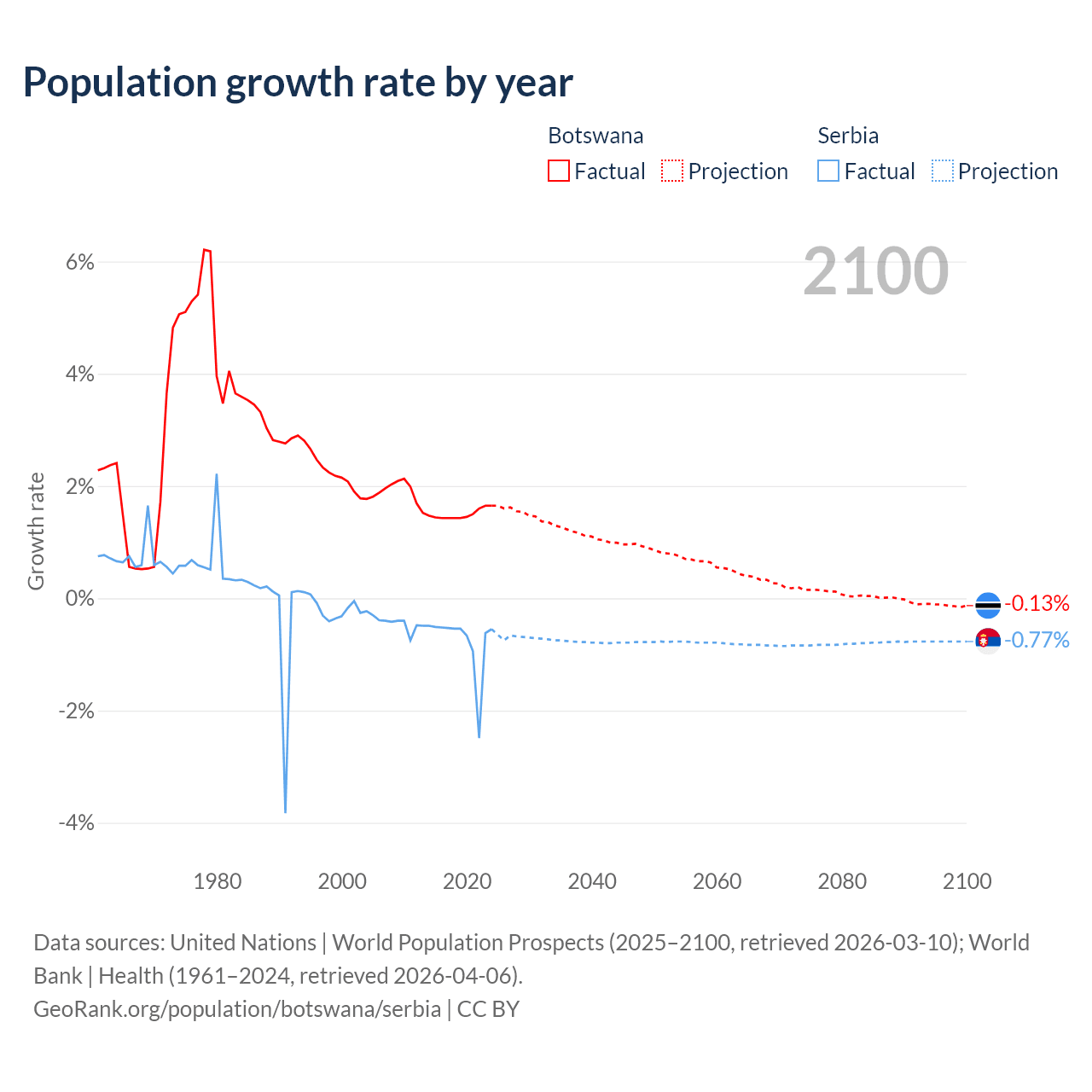 - For the last 10 years, Botswana has had an average growth rate of +1.5% per year vs -0.76% in Serbia.