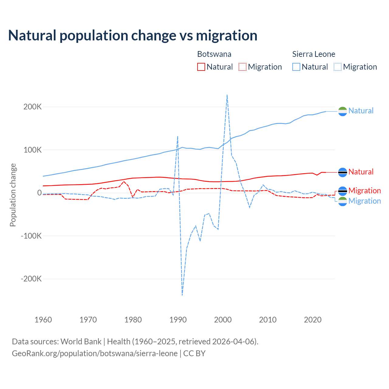 Over the last 10 years, 82.5% of the population change in Botswana is from natural causes (a gain of 436,373 people) and 17.5% is from migration (a loss of 92,293 people). In Sierra Leone 99.6% is from natural causes (a gain of 1,764,049 people) and 0.41% is from migration (a loss of 7,211 people).