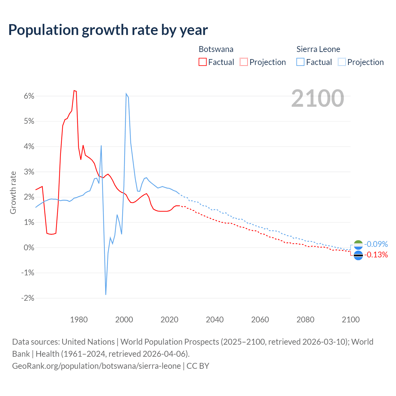 - For the last 10 years, Botswana has had an average growth rate of +1.5% per year vs +2.32% in Sierra Leone.