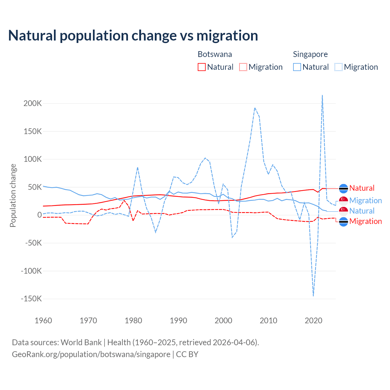 Over the last 10 years, 82.5% of the population change in Botswana is from natural causes (a gain of 436,373 people) and 17.5% is from migration (a loss of 92,293 people). In Singapore 54.8% is from natural causes (a gain of 195,953 people) and 45.2% is from migration (a gain of 161,805 people).