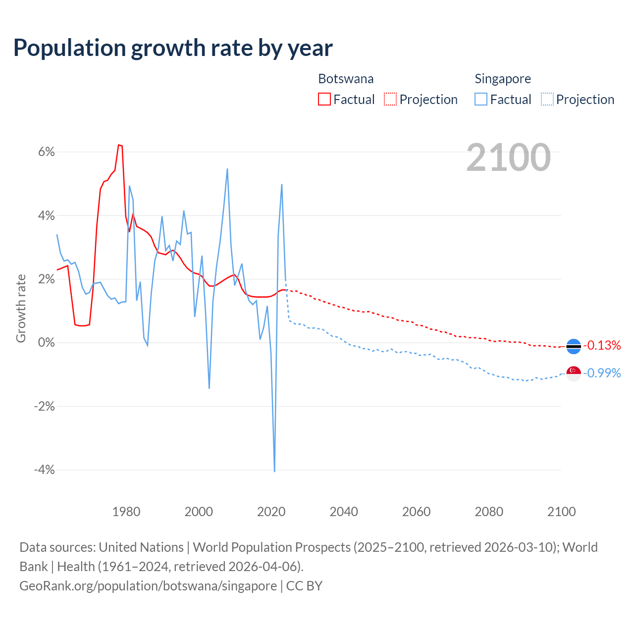 - For the last 10 years, Botswana has had an average growth rate of +1.5% per year vs +1.04% in Singapore.