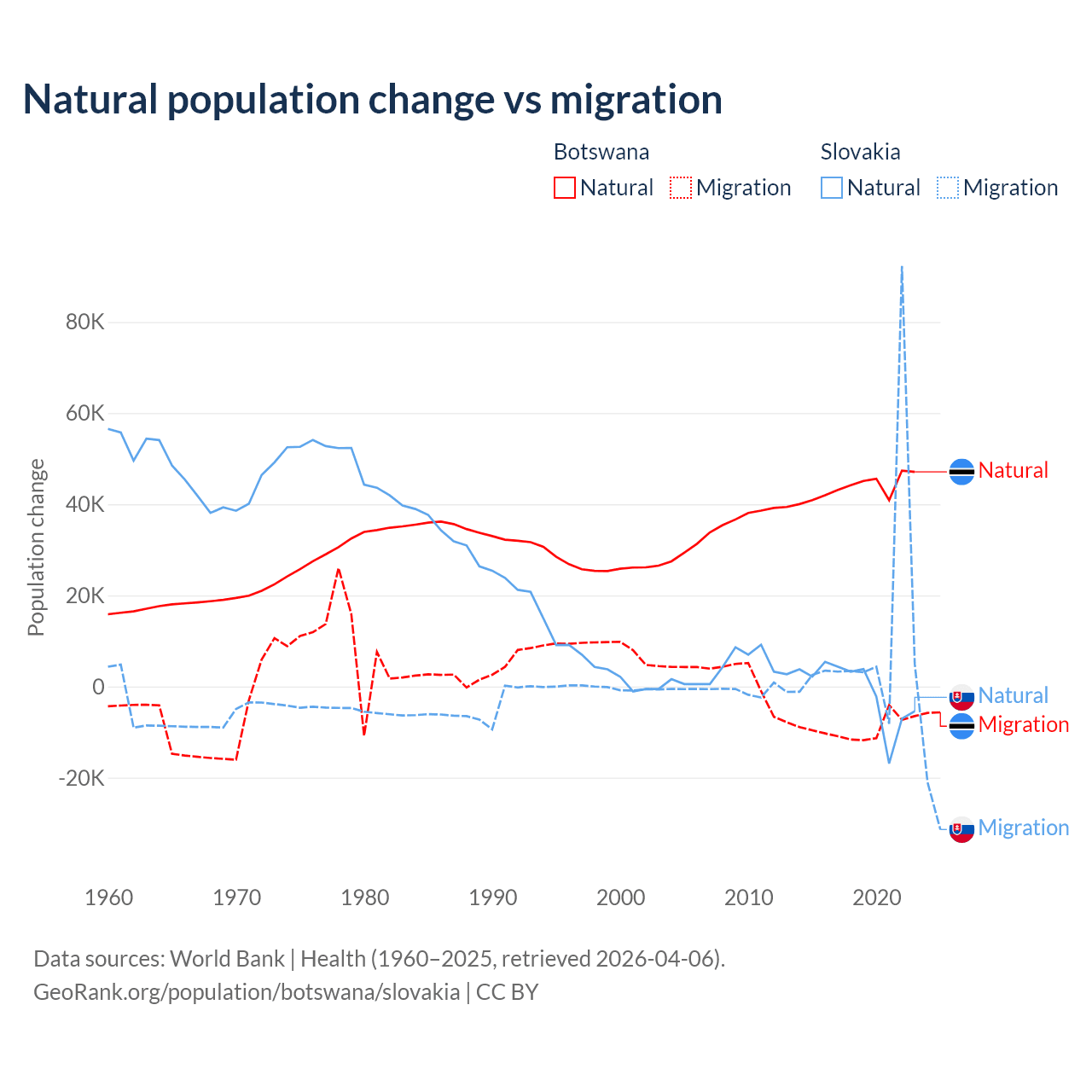 Over the last 10 years, 82.5% of the population change in Botswana is from natural causes (a gain of 436,373 people) and 17.5% is from migration (a loss of 92,293 people). In Slovakia 7.47% is from natural causes (a loss of 8,728 people) and 92.5% is from migration (a gain of 108,156 people).