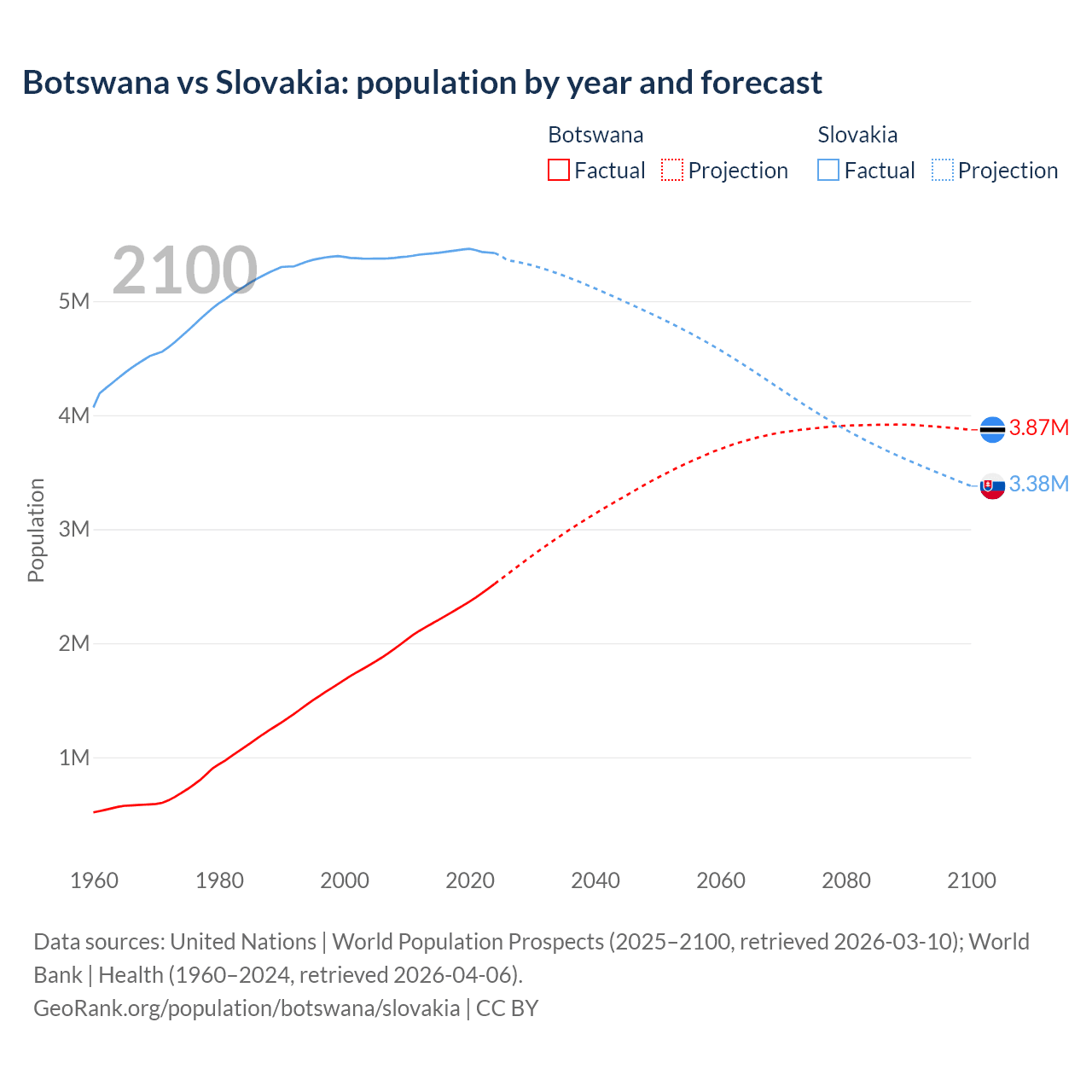 - Since 2006, the population of Botswana has increased from 1.87M people to 2.62M (39.5% growth), while Slovakia has declined from 5.37M to 5.36M (0.25% decline).