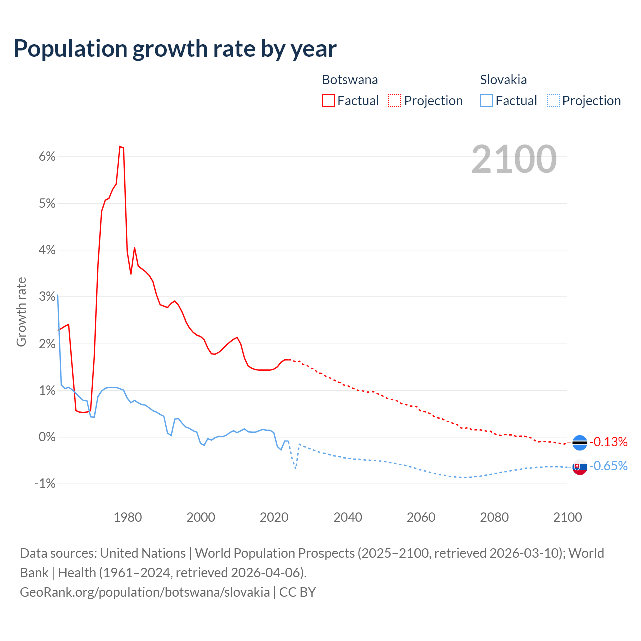 - For the last 10 years, Botswana has had an average growth rate of +1.5% per year vs +0.01% in Slovakia.