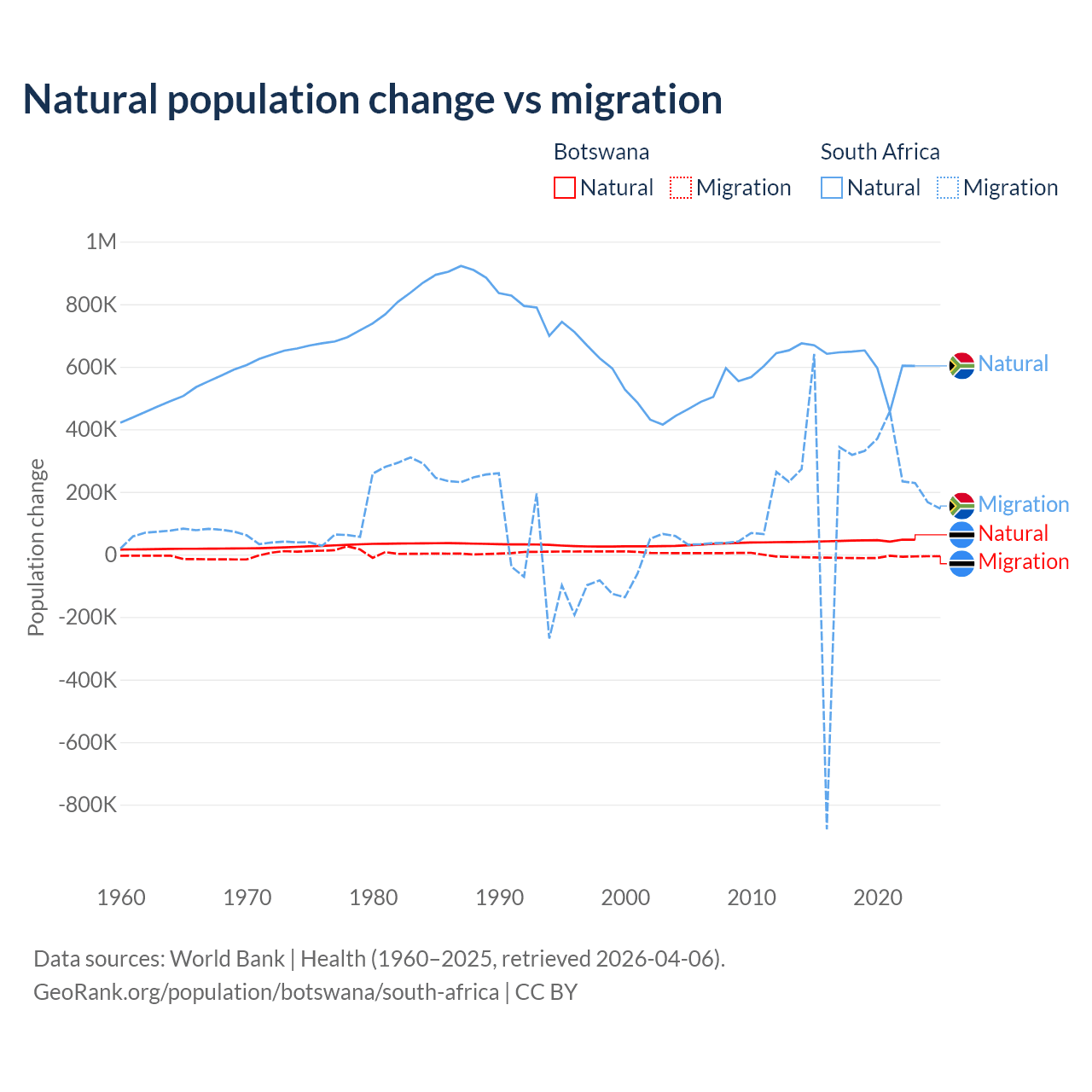Over the last 10 years, 82.5% of the population change in Botswana is from natural causes (a gain of 436,373 people) and 17.5% is from migration (a loss of 92,293 people). In South Africa 72.8% is from natural causes (a gain of 6,190,027 people) and 27.2% is from migration (a gain of 2,316,795 people).