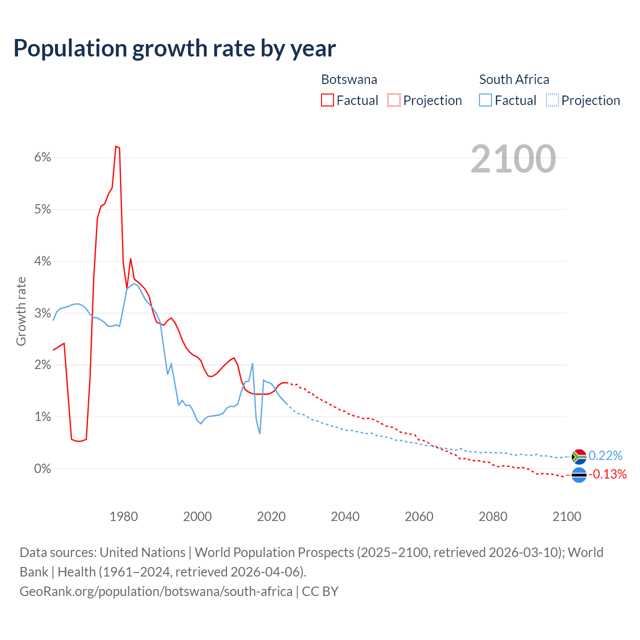 - For the last 10 years, Botswana has had an average growth rate of +1.5% per year vs +1.44% in South Africa.