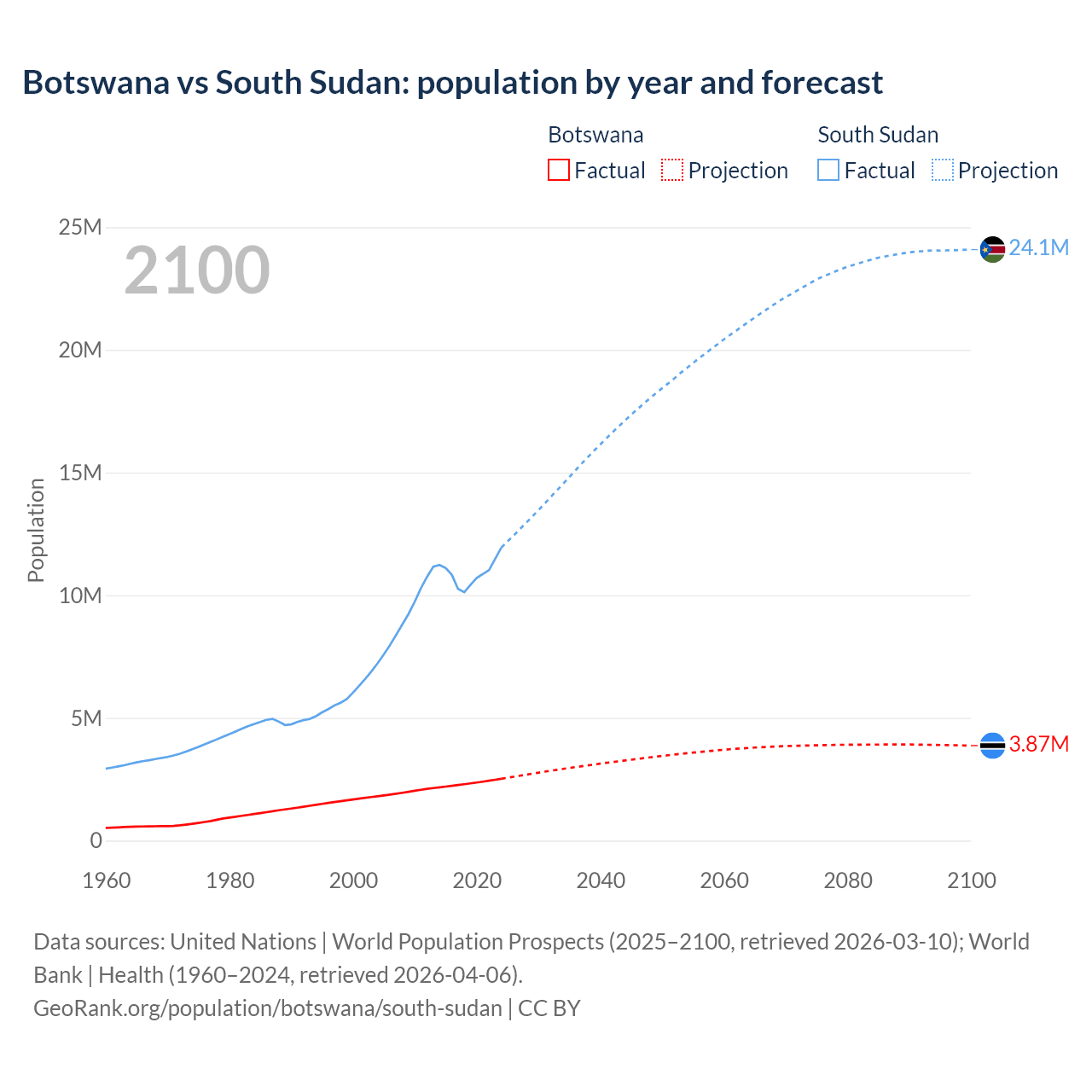 The latest officially reported population of Botswana was 2,521,139 in 2024 vs 11,943,408 people in South Sudan in 2024. In 2026, based on the adjusted UN estimation, the current Botswana's population is 2,615,162 people compared to 12,507,858 in South Sudan.