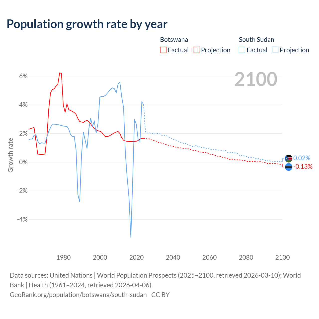 - For the last 10 years, Botswana has had an average growth rate of +1.5% per year vs +0.65% in South Sudan.