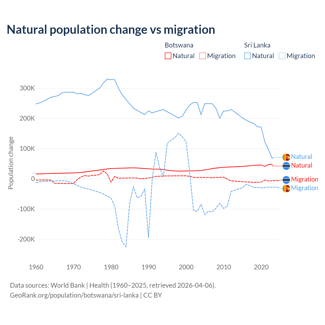 Over the last 10 years, 82.5% of the population change in Botswana is from natural causes (a gain of 436,373 people) and 17.5% is from migration (a loss of 92,293 people). In Sri Lanka 85.3% is from natural causes (a gain of 1,605,749 people) and 14.7% is from migration (a loss of 276,121 people).