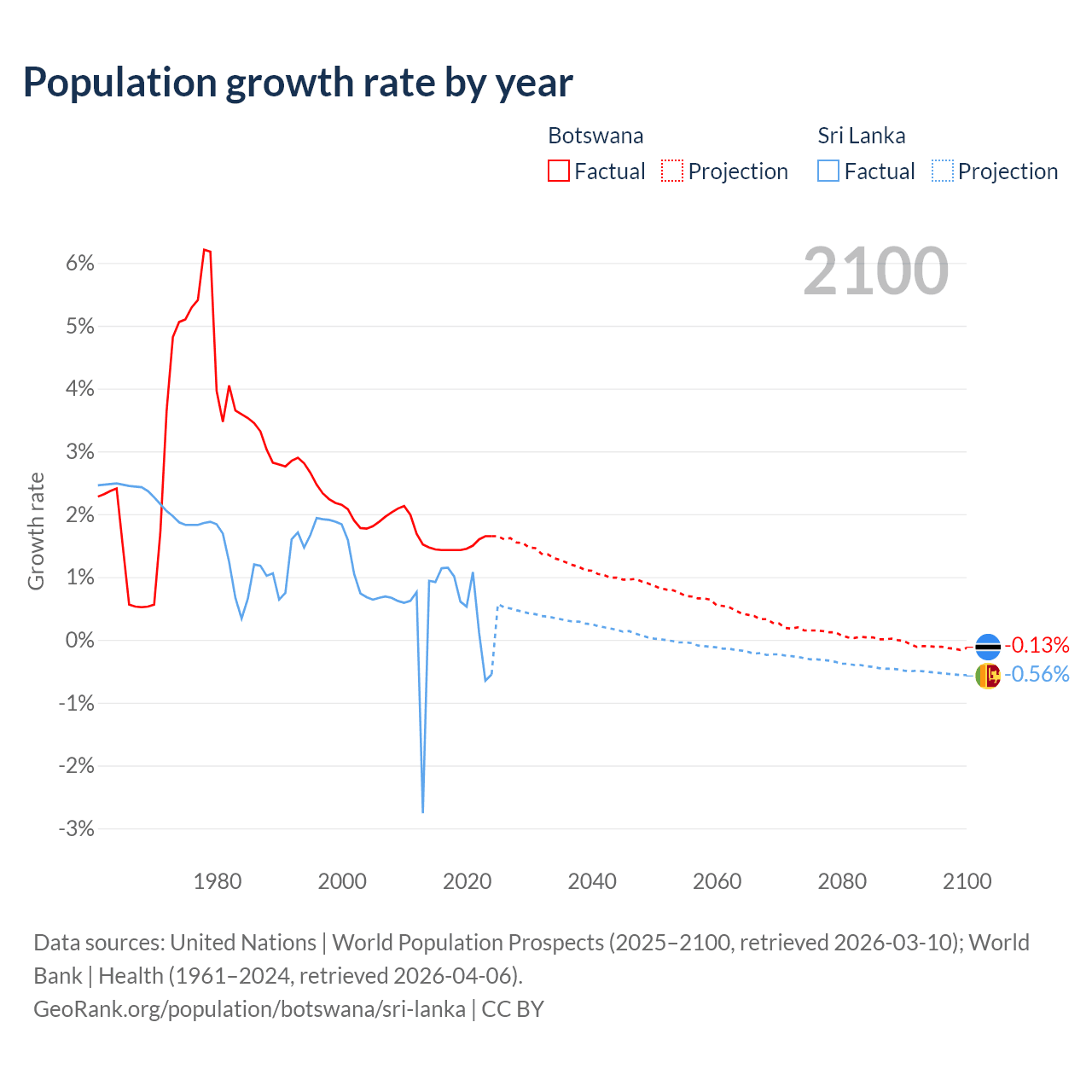 - For the last 10 years, Botswana has had an average growth rate of +1.5% per year vs +0.57% in Sri Lanka.