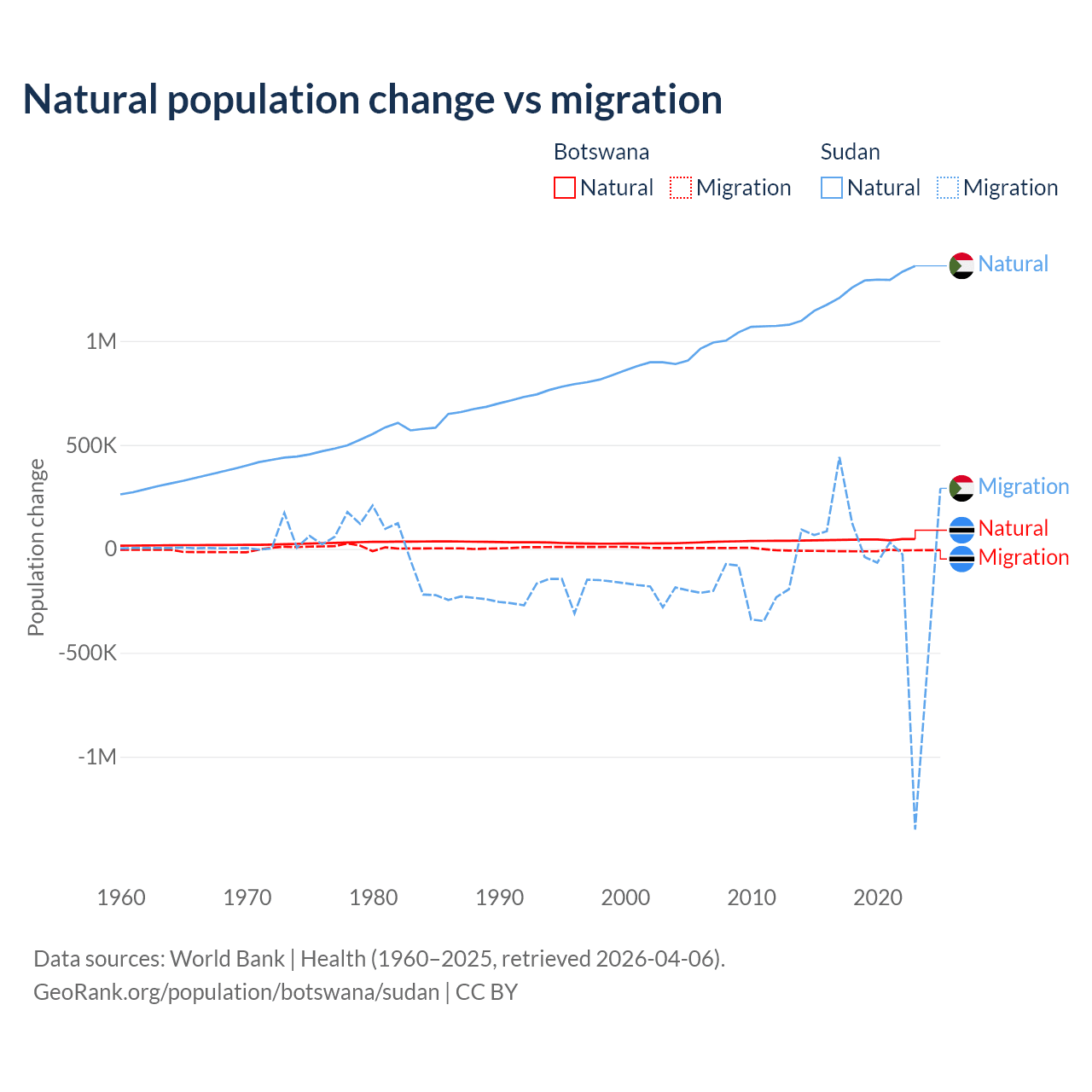 Over the last 10 years, 82.5% of the population change in Botswana is from natural causes (a gain of 436,373 people) and 17.5% is from migration (a loss of 92,293 people). In Sudan 95.1% is from natural causes (a gain of 12,459,977 people) and 4.88% is from migration (a loss of 639,596 people).