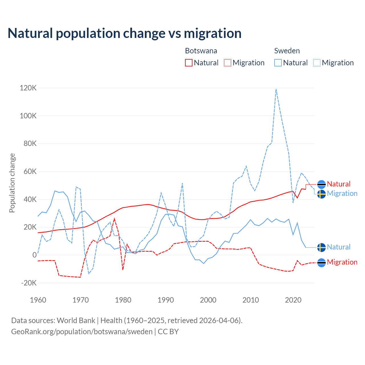 Over the last 10 years, 82.5% of the population change in Botswana is from natural causes (a gain of 436,373 people) and 17.5% is from migration (a loss of 92,293 people). In Sweden 21.4% is from natural causes (a gain of 201,900 people) and 78.6% is from migration (a gain of 743,642 people).