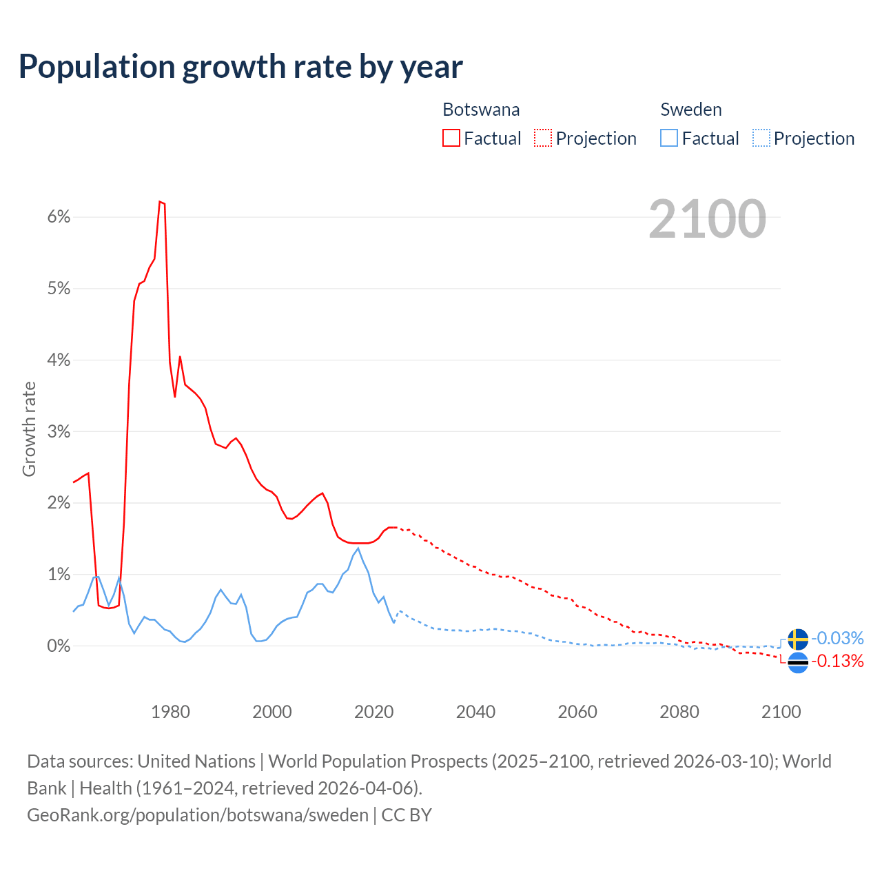 - For the last 10 years, Botswana has had an average growth rate of +1.5% per year vs +0.88% in Sweden.