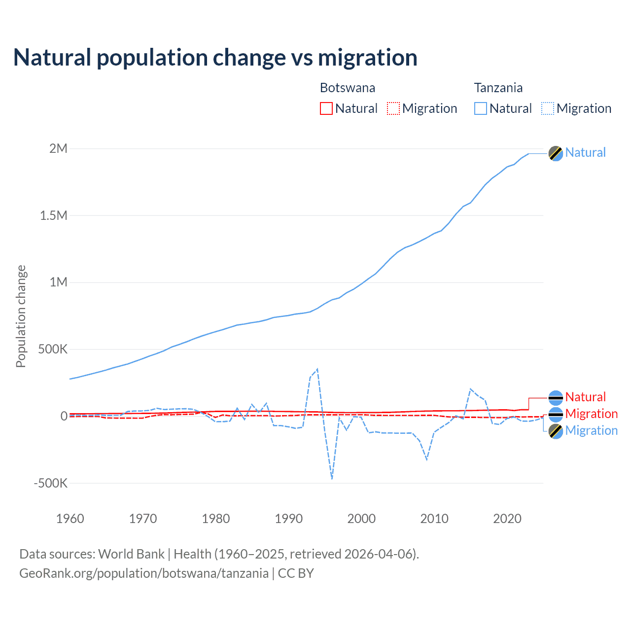 Over the last 10 years, 82.5% of the population change in Botswana is from natural causes (a gain of 436,373 people) and 17.5% is from migration (a loss of 92,293 people). In Tanzania 98.7% is from natural causes (a gain of 17,769,541 people) and 1.27% is from migration (a gain of 229,466 people).