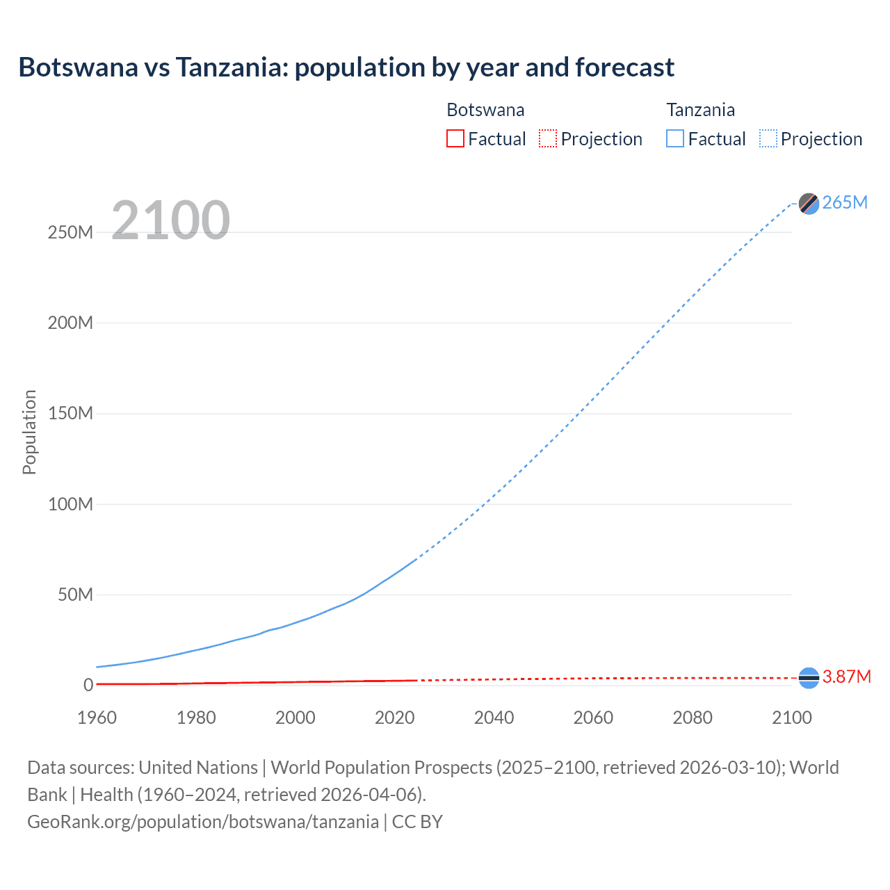 The latest officially reported population of Botswana was 2,521,139 in 2024 vs 68,560,157 people in Tanzania in 2024. In 2026, based on the adjusted UN estimation, the current Botswana's population is 2,615,162 people compared to 73,145,892 in Tanzania.