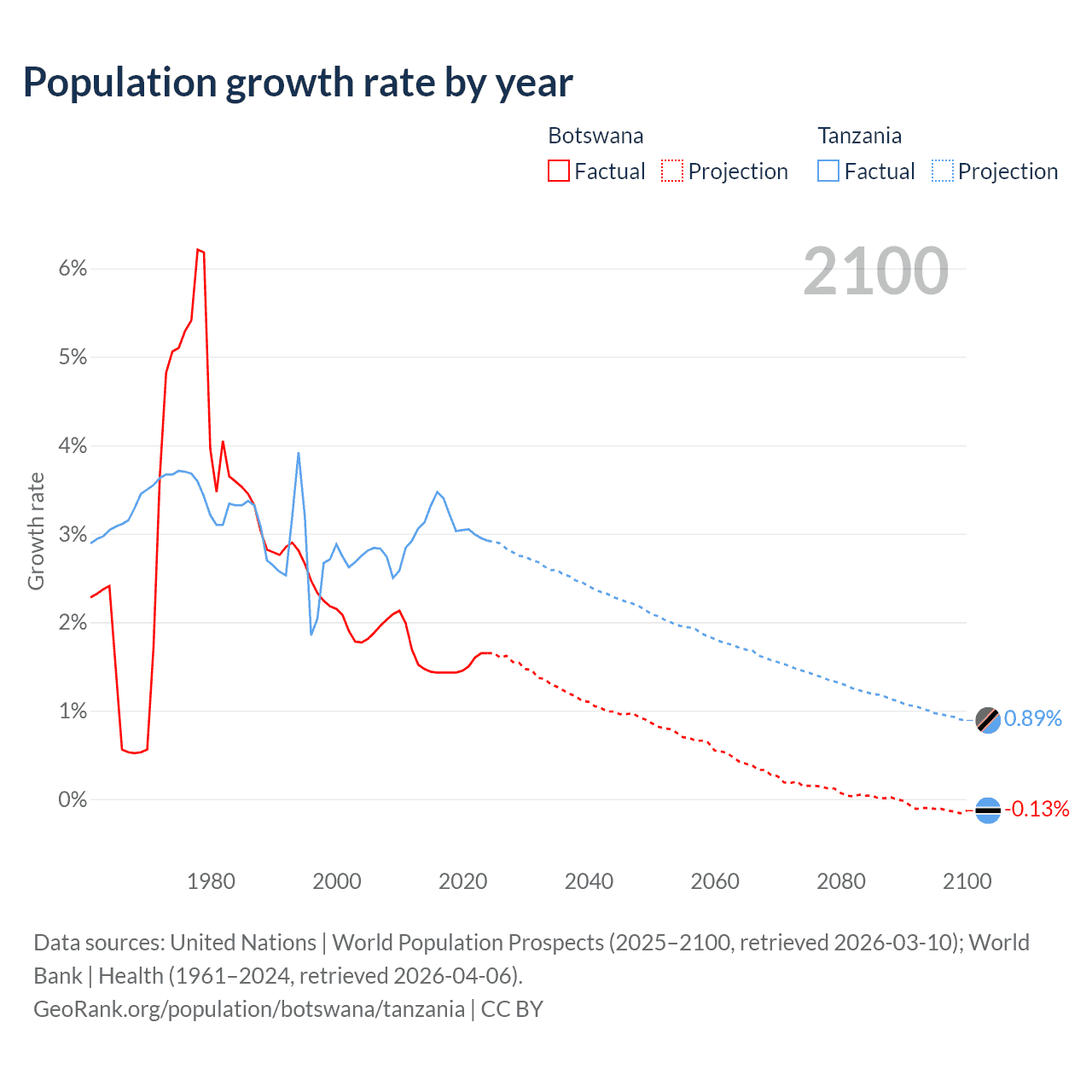 - For the last 10 years, Botswana has had an average growth rate of +1.5% per year vs +3.13% in Tanzania.