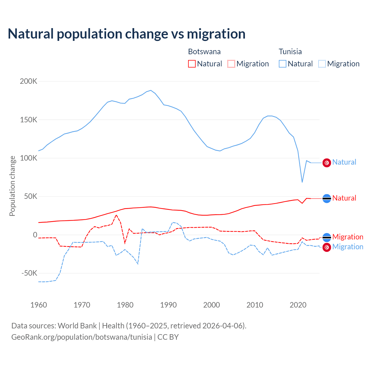 Over the last 10 years, 82.5% of the population change in Botswana is from natural causes (a gain of 436,373 people) and 17.5% is from migration (a loss of 92,293 people). In Tunisia 86.3% is from natural causes (a gain of 1,225,079 people) and 13.7% is from migration (a loss of 195,011 people).
