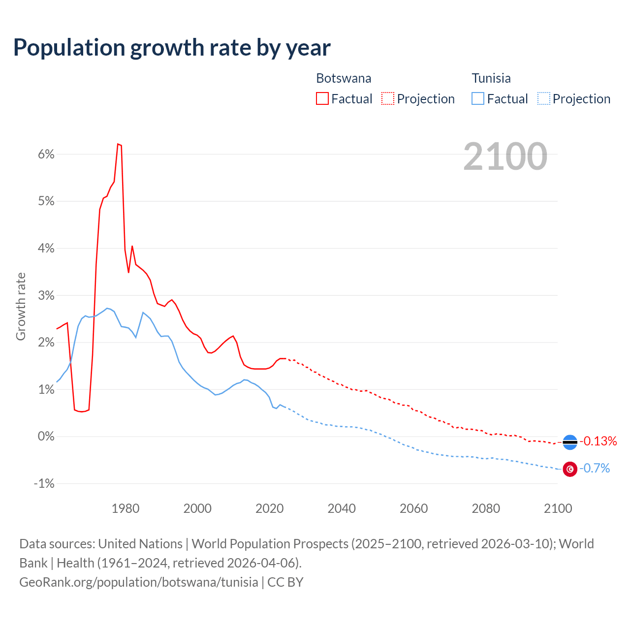 - For the last 10 years, Botswana has had an average growth rate of +1.5% per year vs +0.89% in Tunisia.