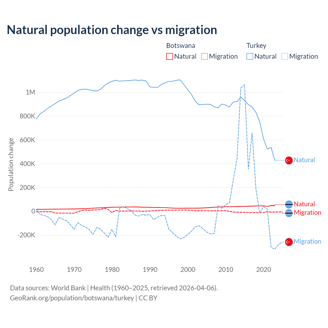 Over the last 10 years, 82.5% of the population change in Botswana is from natural causes (a gain of 436,373 people) and 17.5% is from migration (a loss of 92,293 people). In Turkey 73% is from natural causes (a gain of 7,333,352 people) and 27% is from migration (a gain of 2,718,916 people).