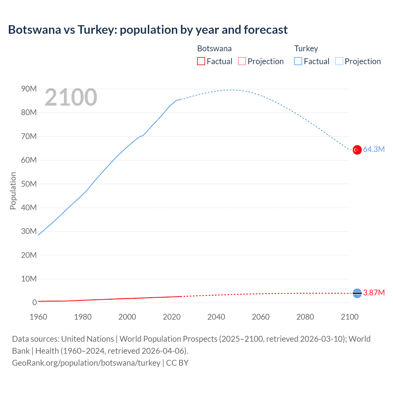 - Since 2006, the population of Botswana has increased from 1.87M people to 2.62M (39.5% growth), while Turkey has grown from 70M to 86M (22.8% growth).