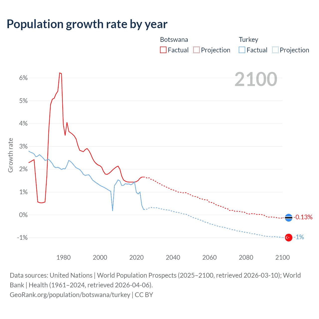 - For the last 10 years, Botswana has had an average growth rate of +1.5% per year vs +1.06% in Turkey.