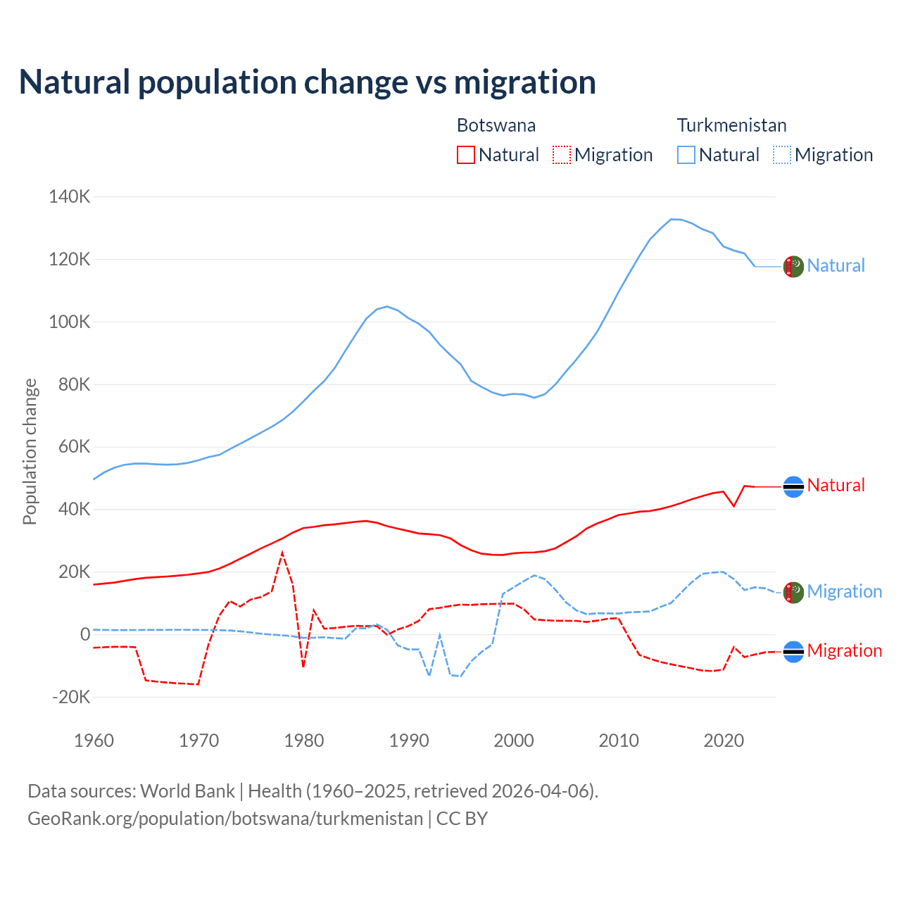 Over the last 10 years, 82.5% of the population change in Botswana is from natural causes (a gain of 436,373 people) and 17.5% is from migration (a loss of 92,293 people). In Turkmenistan 89.2% is from natural causes (a gain of 1,270,228 people) and 10.8% is from migration (a gain of 154,379 people).