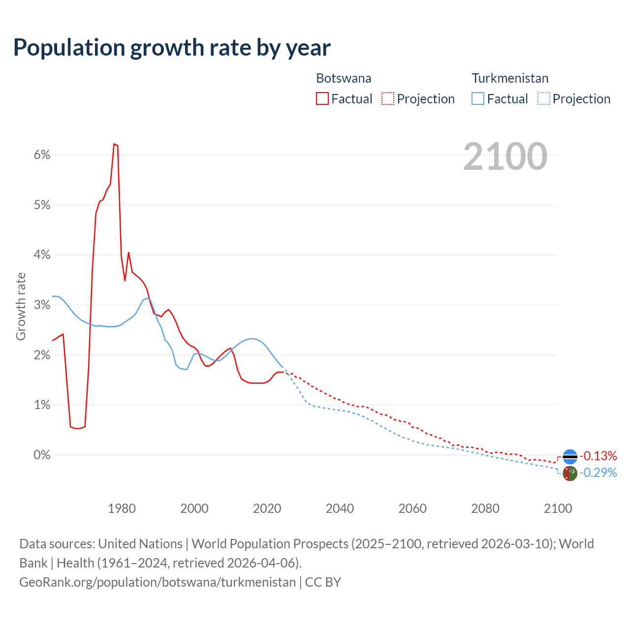 - For the last 10 years, Botswana has had an average growth rate of +1.5% per year vs +2.14% in Turkmenistan.