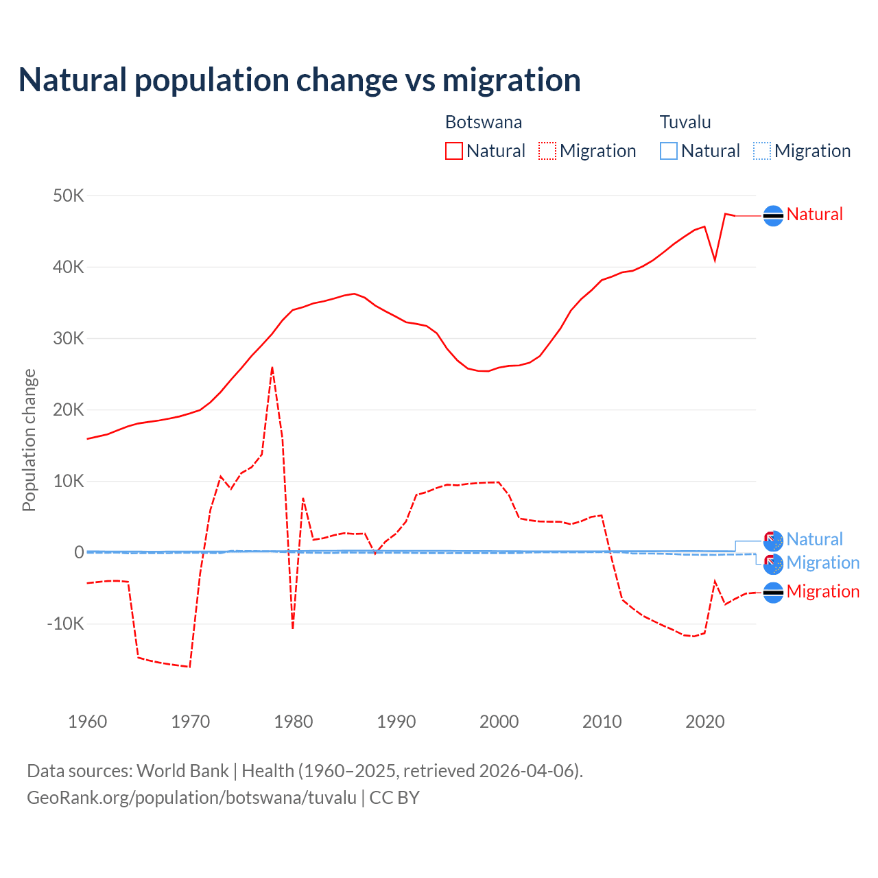 Over the last 10 years, 82.5% of the population change in Botswana is from natural causes (a gain of 436,373 people) and 17.5% is from migration (a loss of 92,293 people). In Tuvalu 35.5% is from natural causes (a gain of 1,556 people) and 64.5% is from migration (a loss of 2,827 people).