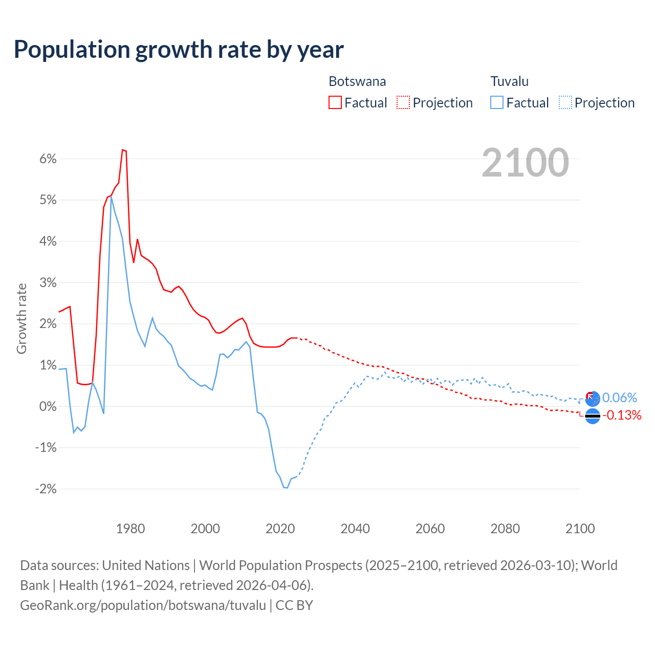 - For the last 10 years, Botswana has had an average growth rate of +1.5% per year vs -1.19% in Tuvalu.