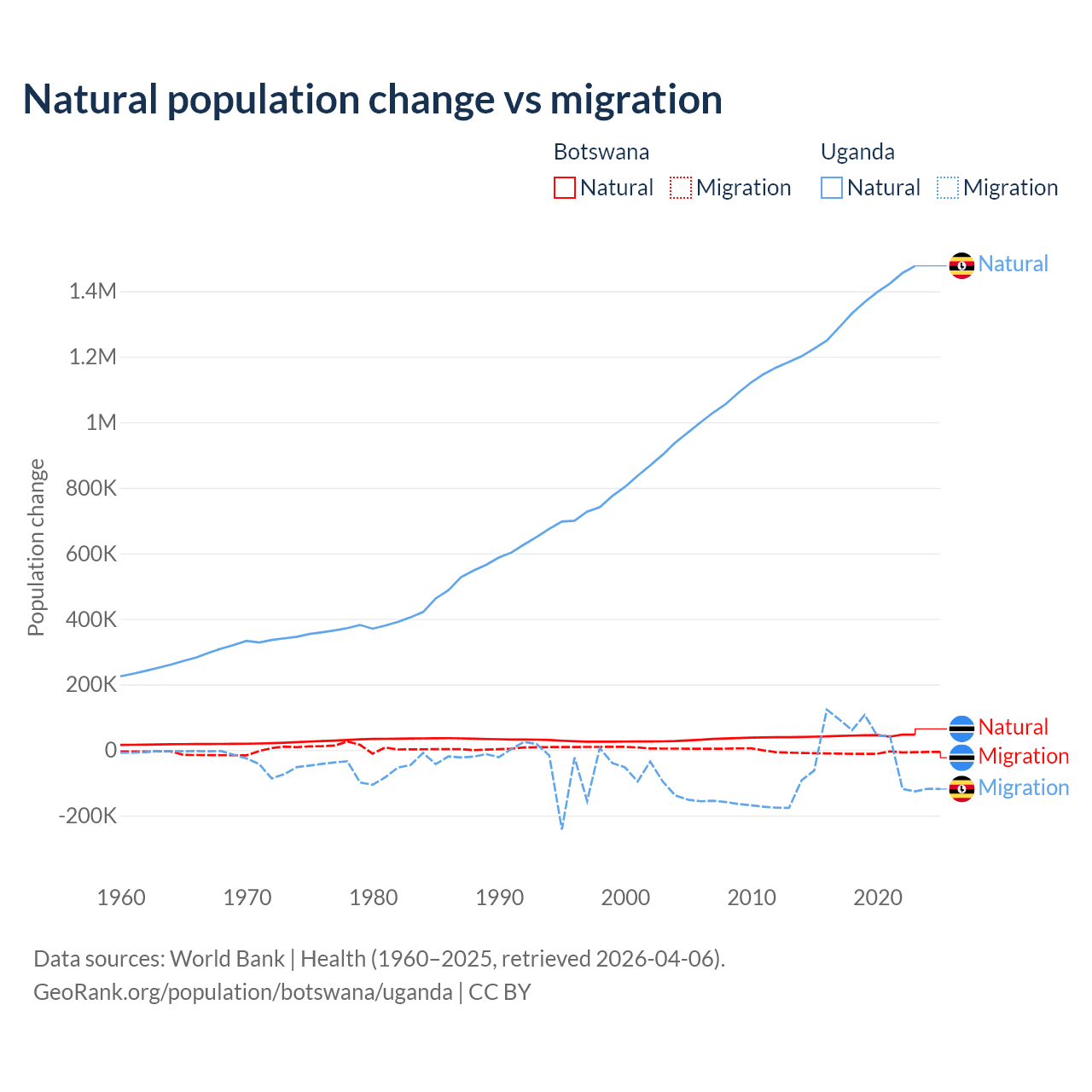 Over the last 10 years, 82.5% of the population change in Botswana is from natural causes (a gain of 436,373 people) and 17.5% is from migration (a loss of 92,293 people). In Uganda 99.5% is from natural causes (a gain of 13,419,712 people) and 0.53% is from migration (a gain of 71,457 people).
