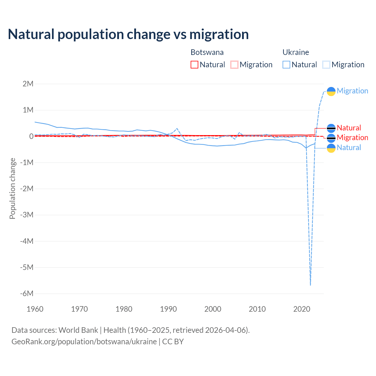 Over the last 10 years, 82.5% of the population change in Botswana is from natural causes (a gain of 436,373 people) and 17.5% is from migration (a loss of 92,293 people). In Ukraine 28.2% is from natural causes (a loss of 2,435,153 people) and 71.8% is from migration (a loss of 6,198,995 people).