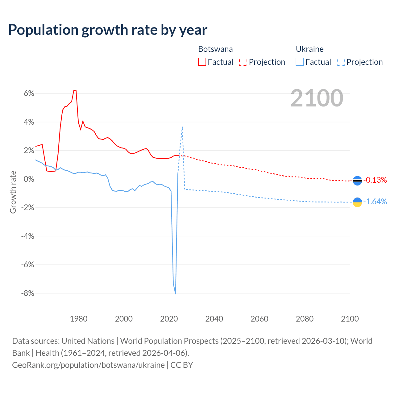 - For the last 10 years, Botswana has had an average growth rate of +1.5% per year vs -1.74% in Ukraine.