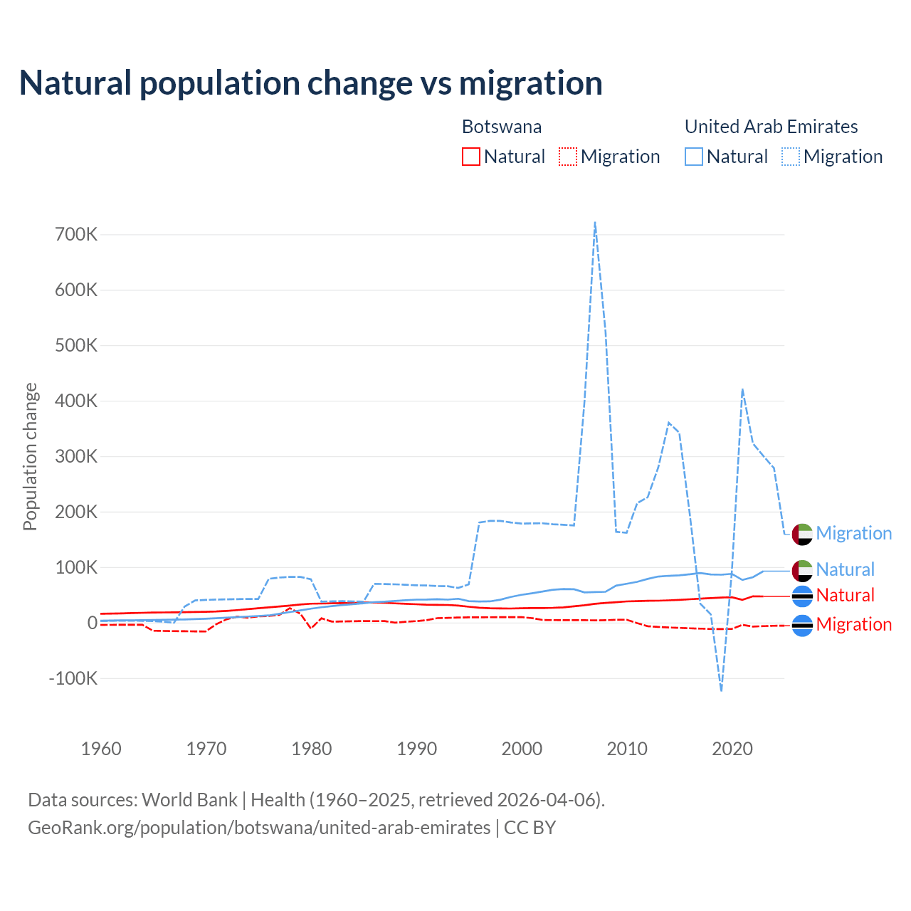 Over the last 10 years, 82.5% of the population change in Botswana is from natural causes (a gain of 436,373 people) and 17.5% is from migration (a loss of 92,293 people). In the United Arab Emirates 30.5% is from natural causes (a gain of 857,996 people) and 69.5% is from migration (a gain of 1,958,520 people).