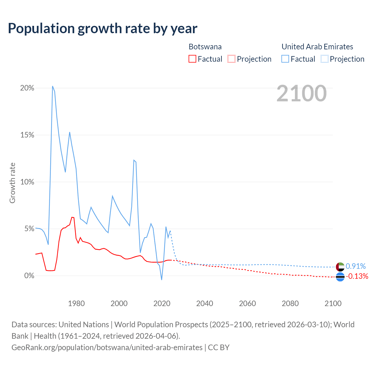 - For the last 10 years, Botswana has had an average growth rate of +1.5% per year vs +3.31% in the United Arab Emirates.