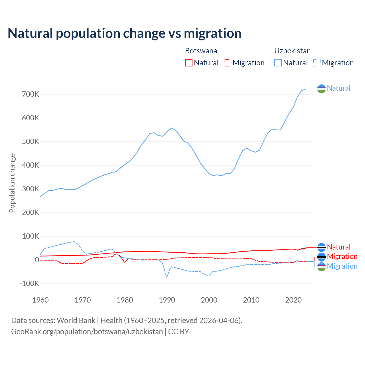 Over the last 10 years, 82.5% of the population change in Botswana is from natural causes (a gain of 436,373 people) and 17.5% is from migration (a loss of 92,293 people). In Uzbekistan 98.2% is from natural causes (a gain of 6,161,117 people) and 1.84% is from migration (a loss of 115,398 people).