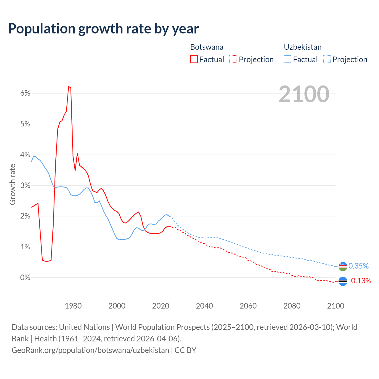 - For the last 10 years, Botswana has had an average growth rate of +1.5% per year vs +1.85% in Uzbekistan.
