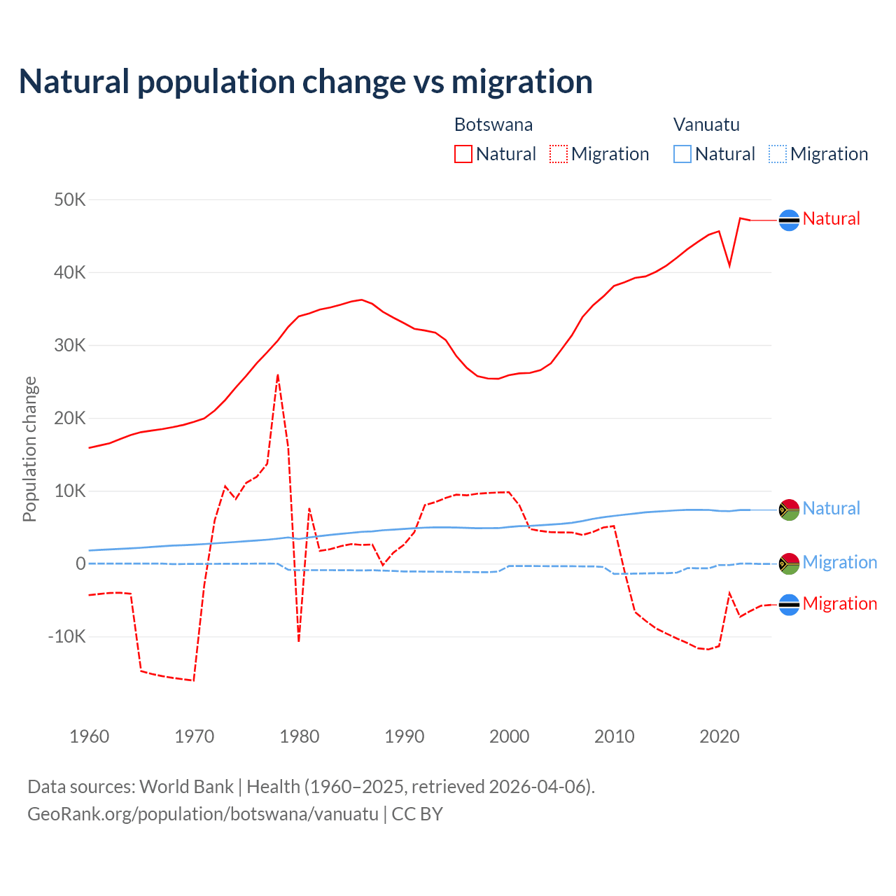 Over the last 10 years, 82.5% of the population change in Botswana is from natural causes (a gain of 436,373 people) and 17.5% is from migration (a loss of 92,293 people). In Vanuatu 92.2% is from natural causes (a gain of 72,941 people) and 7.81% is from migration (a loss of 6,181 people).