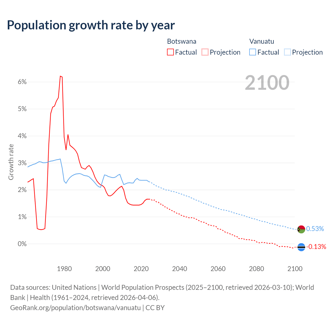 - For the last 10 years, Botswana has had an average growth rate of +1.5% per year vs +2.33% in Vanuatu.