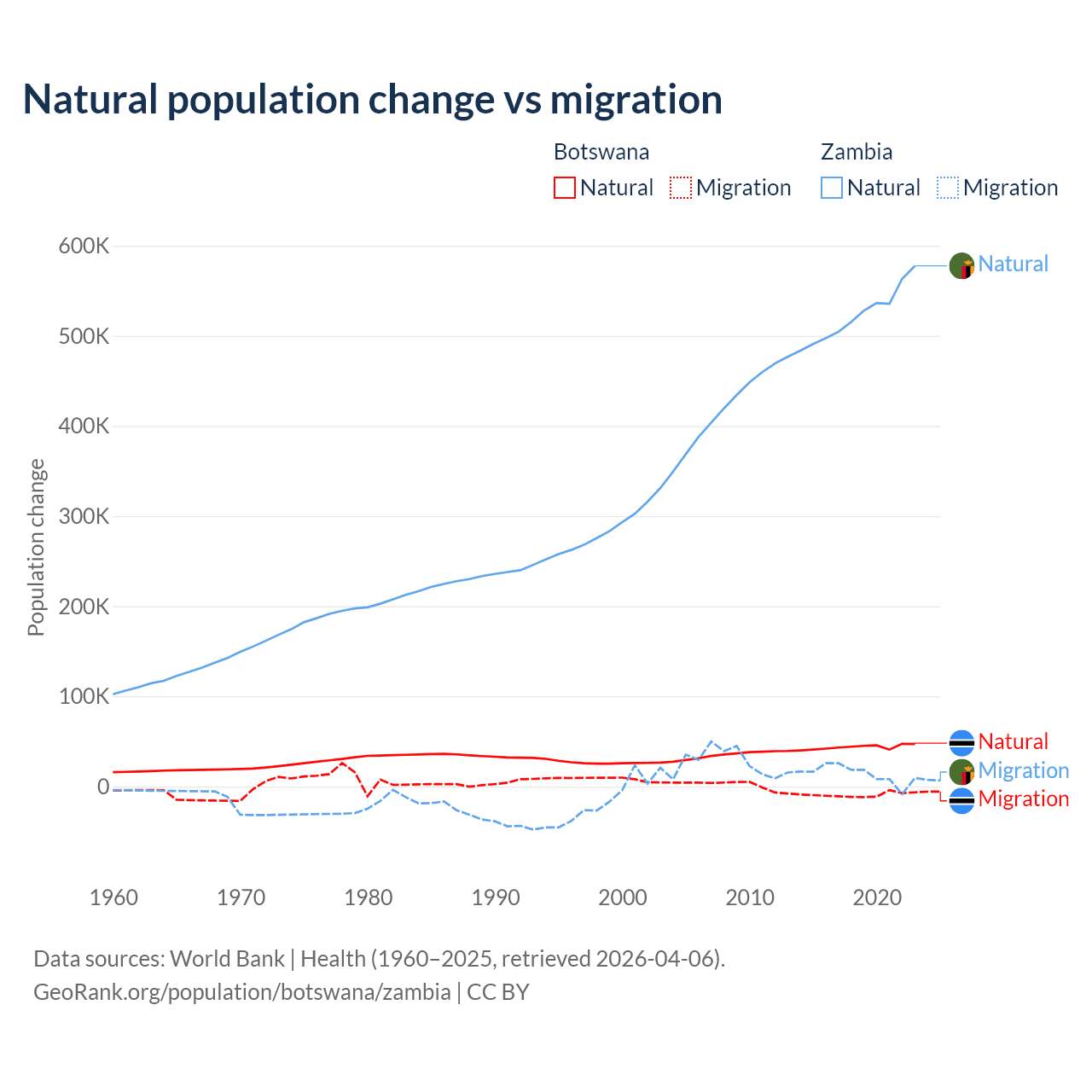 Over the last 10 years, 82.5% of the population change in Botswana is from natural causes (a gain of 436,373 people) and 17.5% is from migration (a loss of 92,293 people). In Zambia 97.4% is from natural causes (a gain of 5,233,797 people) and 2.58% is from migration (a gain of 138,554 people).