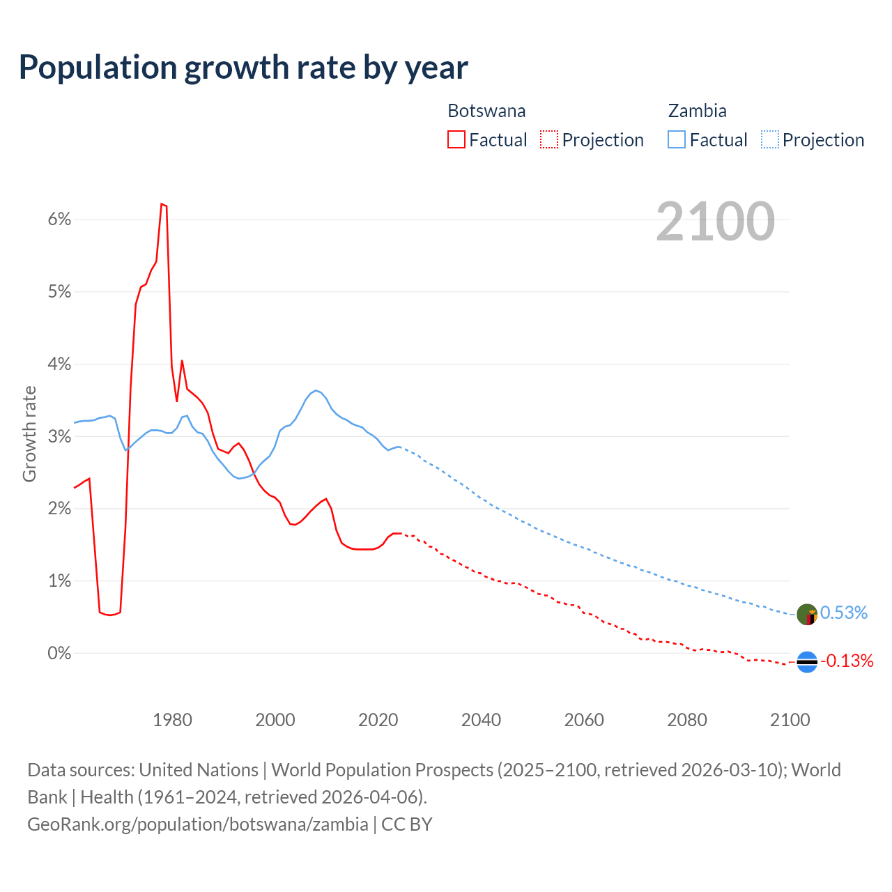 Botswana vs Zambia: population by year and forecast