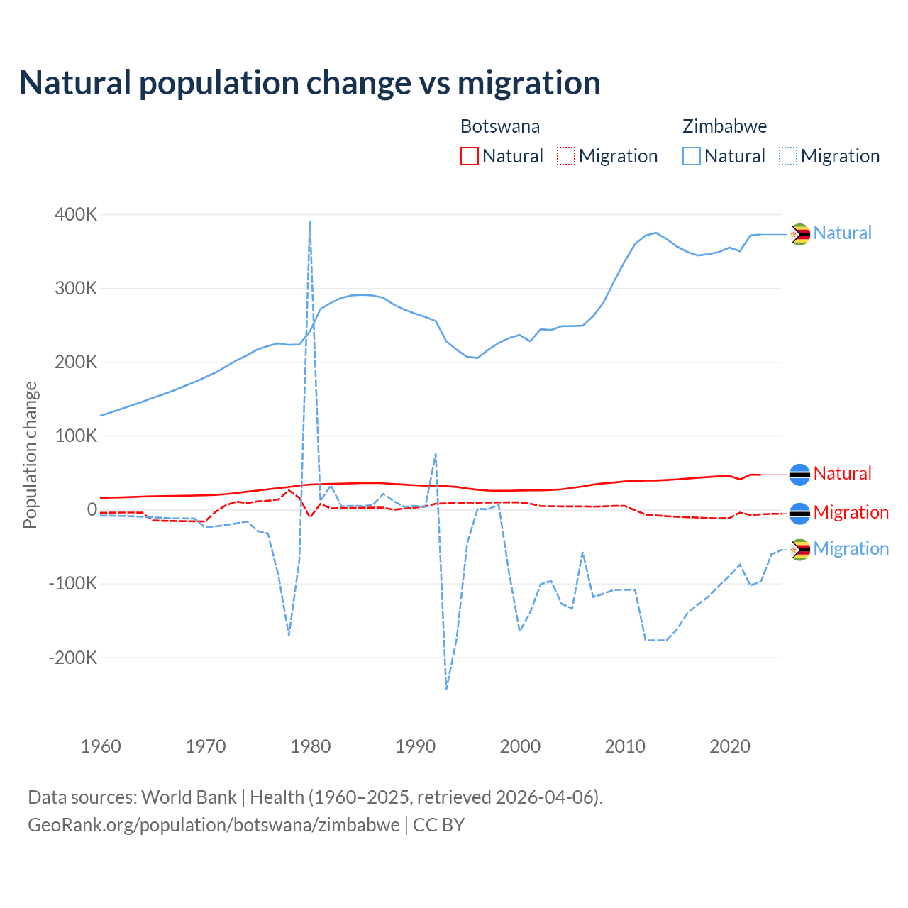Over the last 10 years, 82.5% of the population change in Botswana is from natural causes (a gain of 436,373 people) and 17.5% is from migration (a loss of 92,293 people). In Zimbabwe 74.9% is from natural causes (a gain of 3,558,487 people) and 25.1% is from migration (a loss of 1,192,807 people).