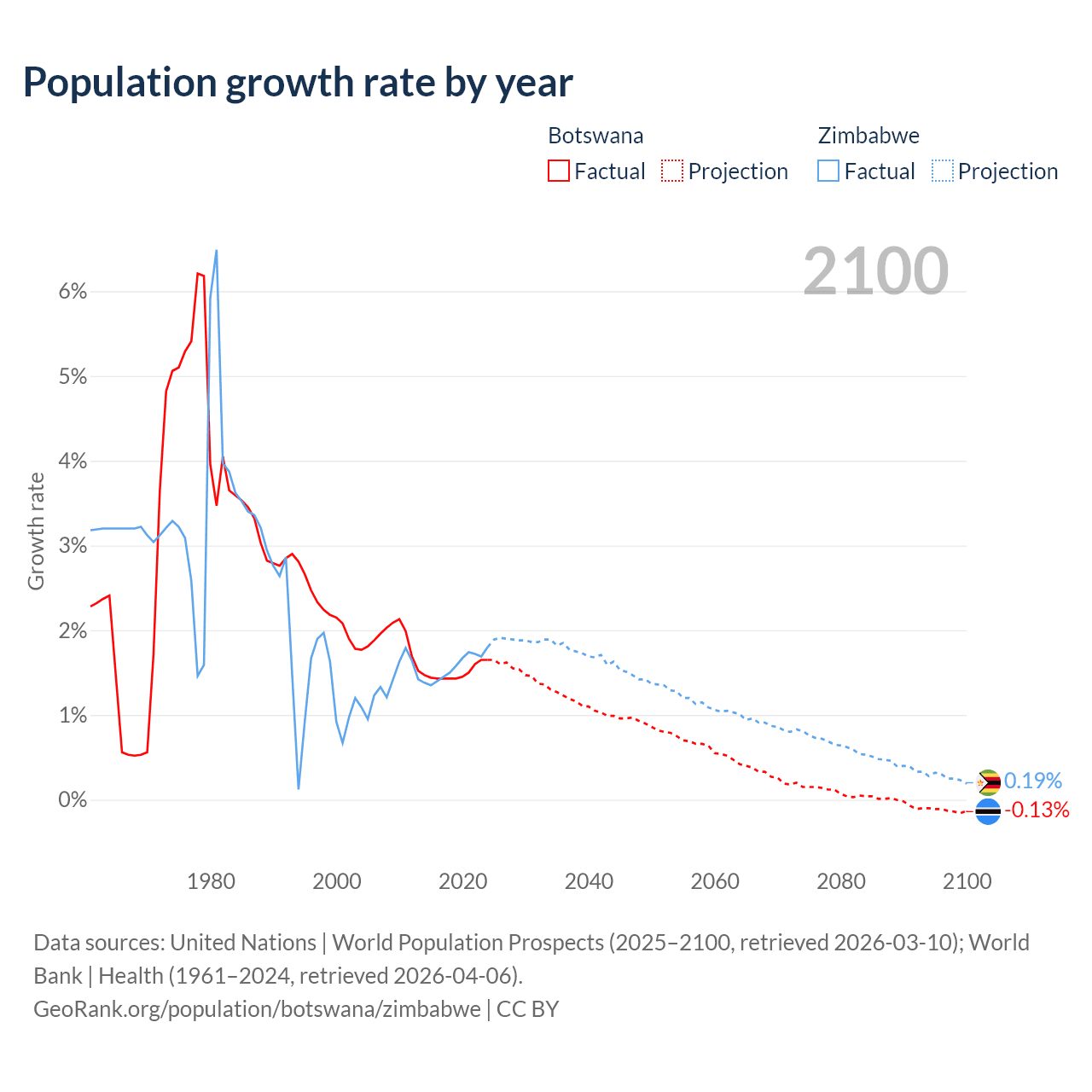 - For the last 10 years, Botswana has had an average growth rate of +1.5% per year vs +1.57% in Zimbabwe.
