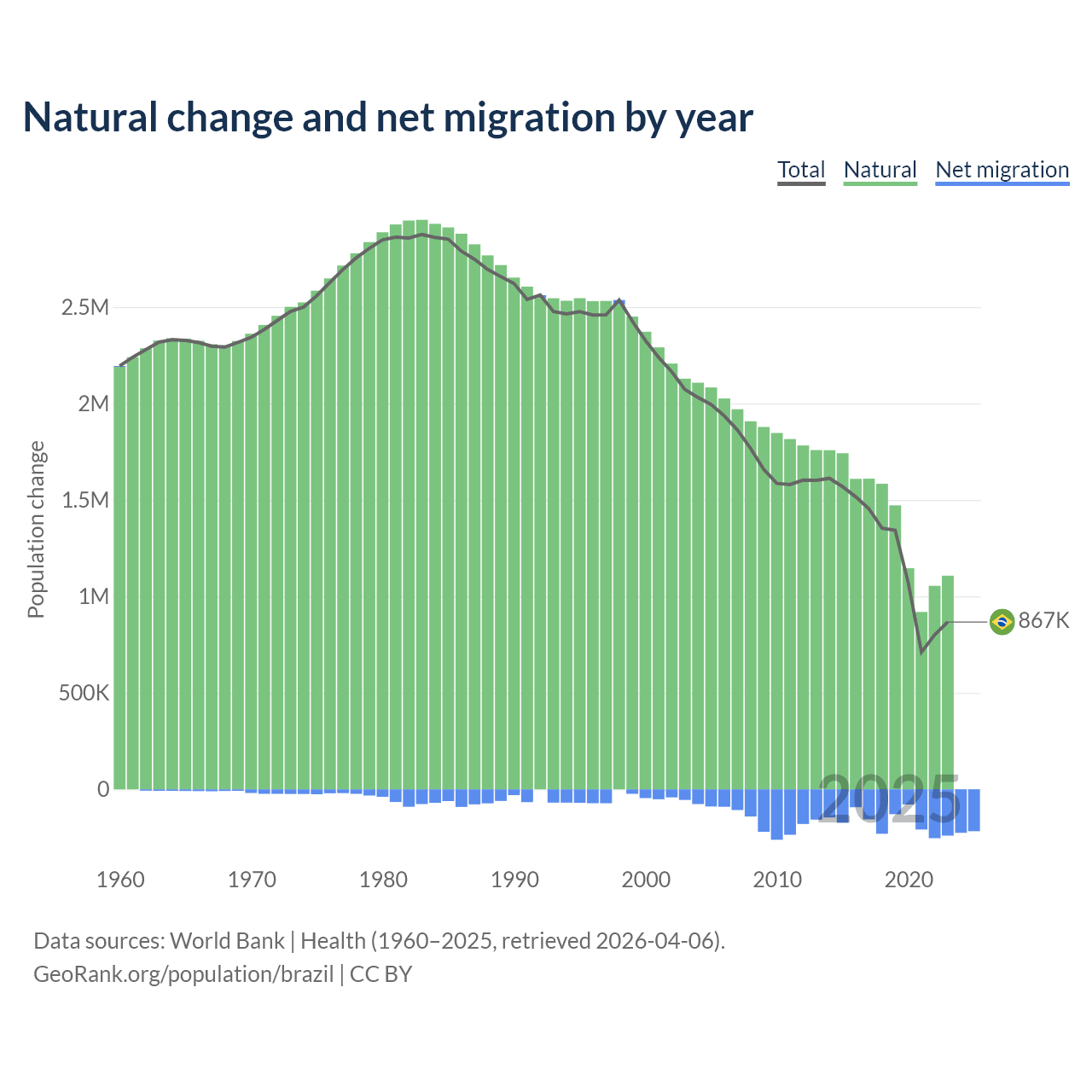 - For the last 20 years, Brazil has had an average growth rate of 0.73% per year.