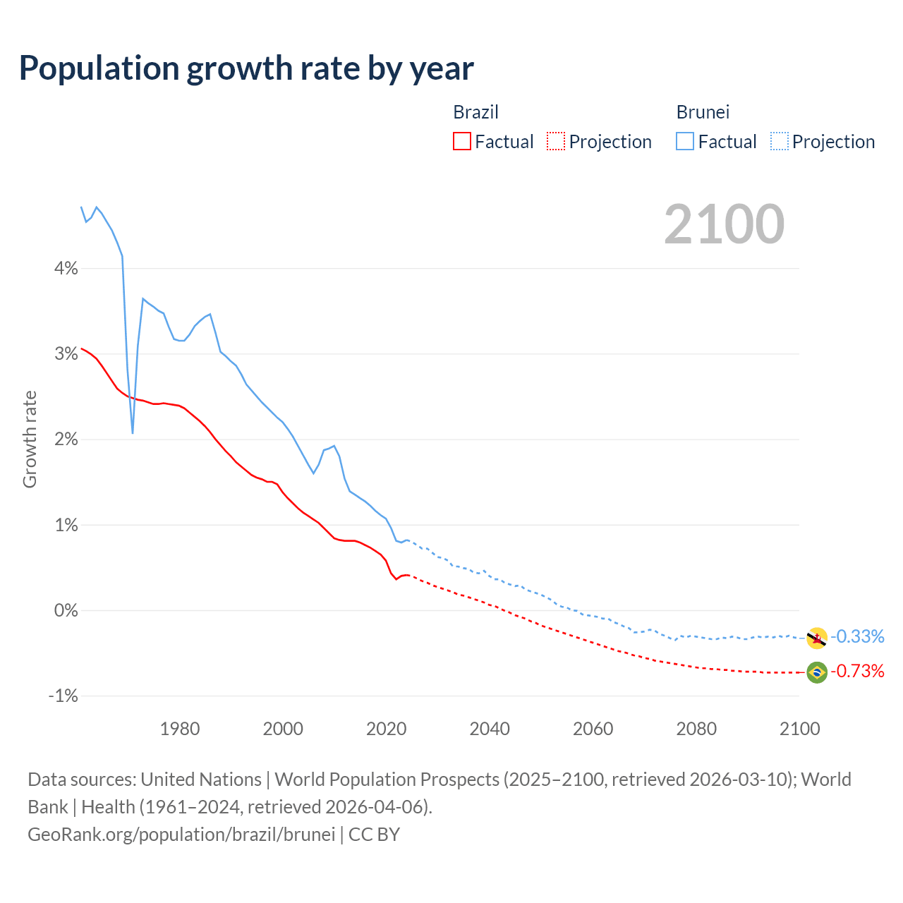 - For the last 10 years, Brazil has had an average growth rate of +0.6% per year vs +1.08% in Brunei.