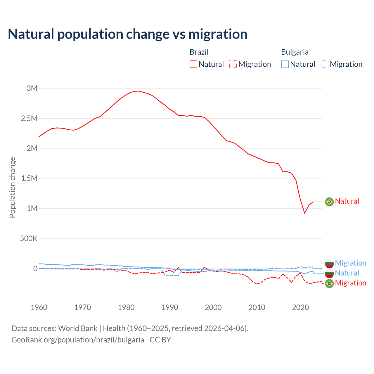 Over the last 10 years, 89.1% of the population change in Brazil is from natural causes (a gain of 14,004,164 people) and 10.9% is from migration (a loss of 1,708,894 people). In Bulgaria 92.1% is from natural causes (a loss of 528,535 people) and 7.94% is from migration (a gain of 45,567 people).