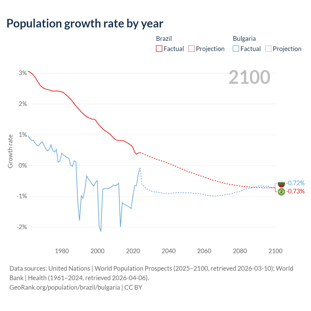 - For the last 10 years, Brazil has had an average growth rate of +0.6% per year vs -0.96% in Bulgaria.